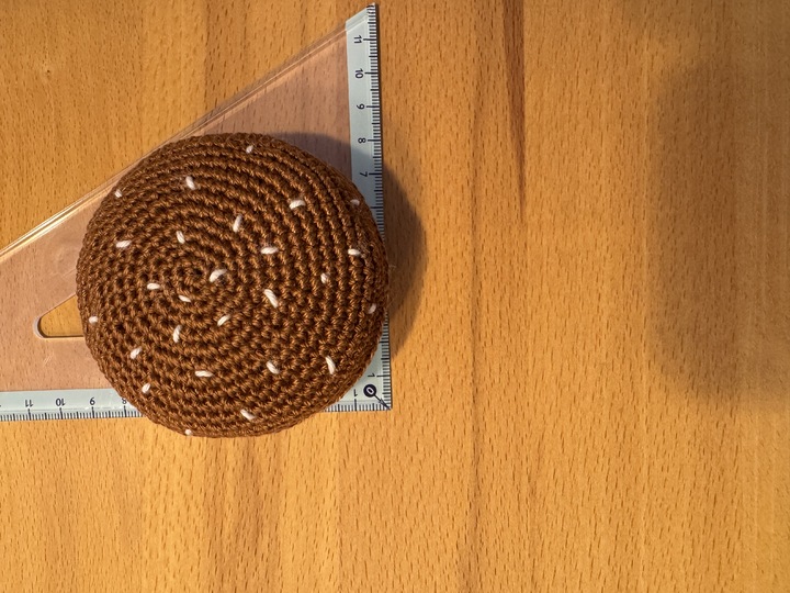 Zusammengesetzt hat mein Burger eine Größe von 8 cm Durchmesser und ist mit allem Belag ca. 8,5 cm hoch.