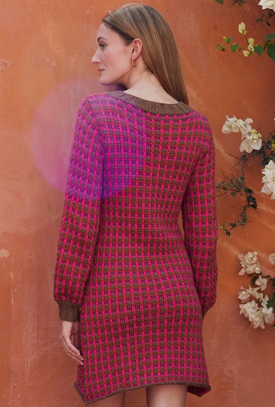 Muster in Hebemaschen-Technik haben einen unschlagbaren Vorteil: Man strickt immer nur mit einer Farbe. Achte darauf, dass du beim Stricken den Faden, den du nicht benutzt, in den Hinreihen immer auf der Rückseite und in den Rückreihe immer auf der Vorderseite der Arbeit mitführst. Und das nicht allzu fest, weil sich sonst das Teil zusammenzieht. Auf jeden Fall entwickelt sich auf einfache Art und Weise eine tolle Optik in vier leuchtenden Tönen. Insgesamt ein Kleid, das garantiert Blicke auf sich zieht.