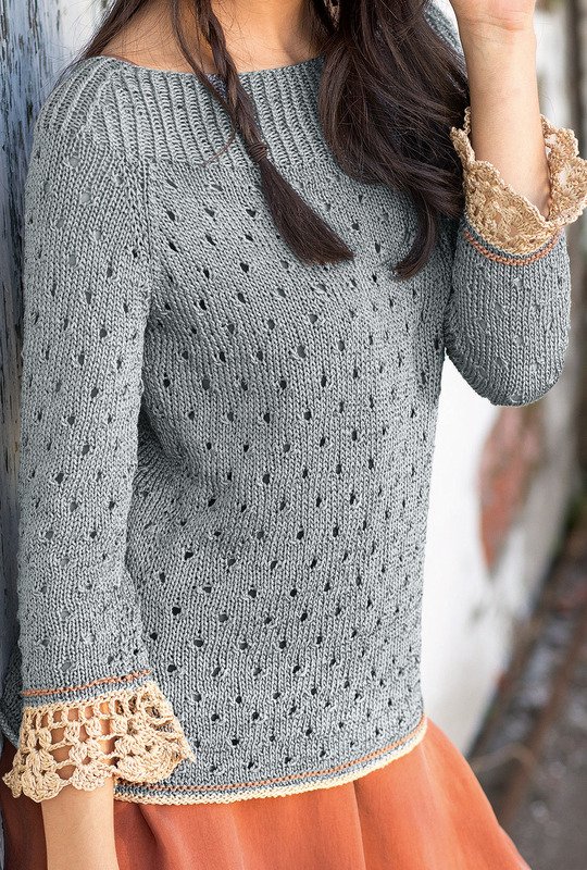 Ein Must-Have für alle Handarbeitsliebhaber – dieser gestrickte graue Pullover verbindet geschickt Eleganz mit natürlicher Lässigkeit. Das Highlight des Raglanpullis sind die farblich abgesetzten Häkelrüschen, die einen charmanten Boho-Effekt kreieren. Die gehäkelten Ärmelbordüren in Sand, Stein und Graphit verleihen der Masche eine subtile, natürliche Note. Die sorgfältig ausgearbeitete Kragenblende und das schlichte Lochmuster sorgen für eine wohlproportionierte Ästhetik. Perfekt für einen individuellen Stil, ist dieser Pullover ein harmonisches Zusammenspiel aus Details und Design.