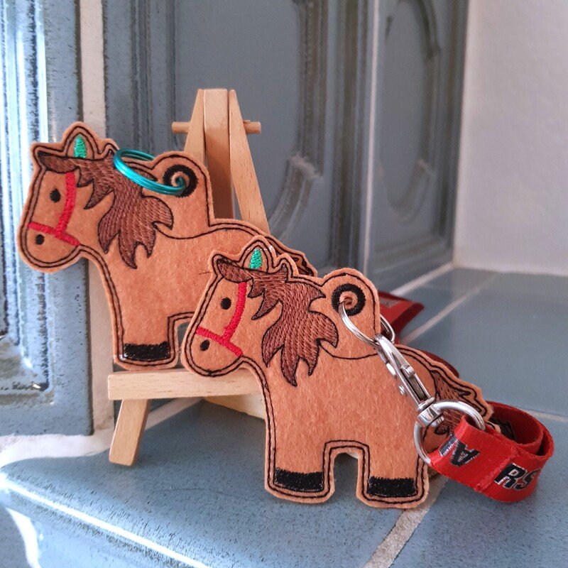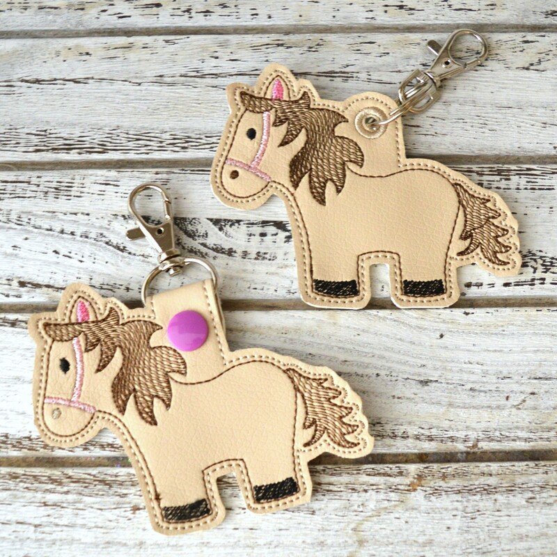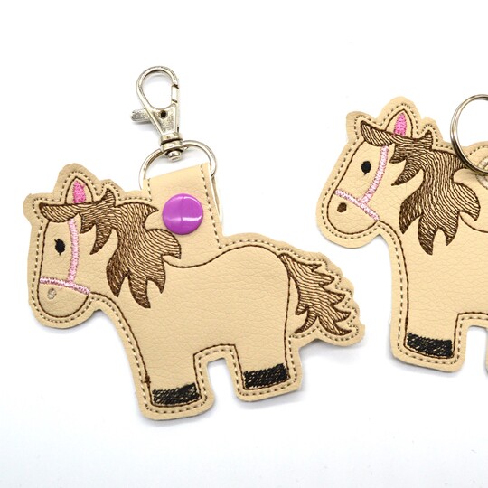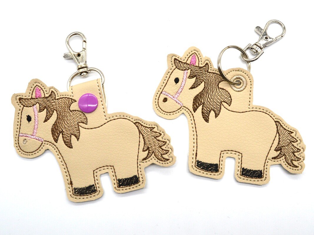 Schlüsselanhänger für Druckknöpfe oder auch als Anhänger mit gestickter Öse. Der Stickgang für die Öse kann auch weggelassen werden, um eine Metallöse anzubringen. Es wird stets ein Pferd im 10x10cm Stickrahmen gestickt.