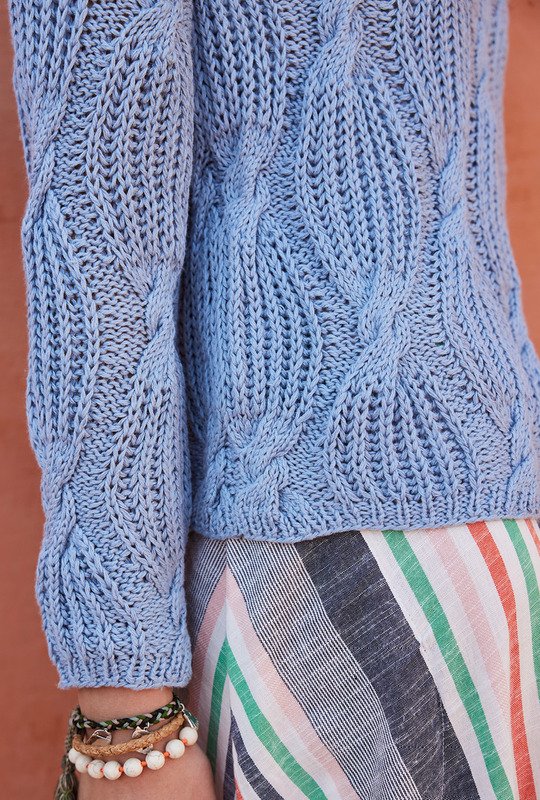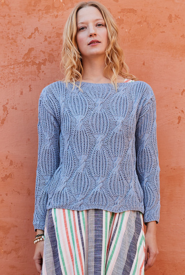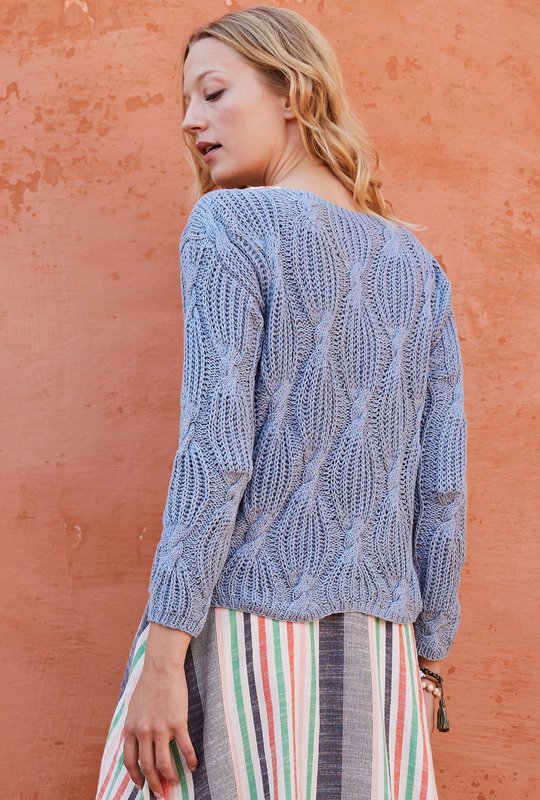 Das Patentmuster mit Zöpfen ist nicht ganz einfach und man braucht ein bisschen Geduld, damit die Arbeit gut von der Nadel geht. Deshalb empfehlen wir dir, auf jeden Fall nach unserer Strickschrift eine Maschenprobe zu machen, so kannst du ein bisschen üben. Im Gegenzug haben wir alle Teile gerade gearbeitet, der Passform zuliebe haben wir allerdings bei den Ärmeln eine leichte Schrägung eingebaut. Oben schließt der Pulli mit einer schmalen Rippenblende ab und lässt dadurch den modischen Turtleneck entstehen.