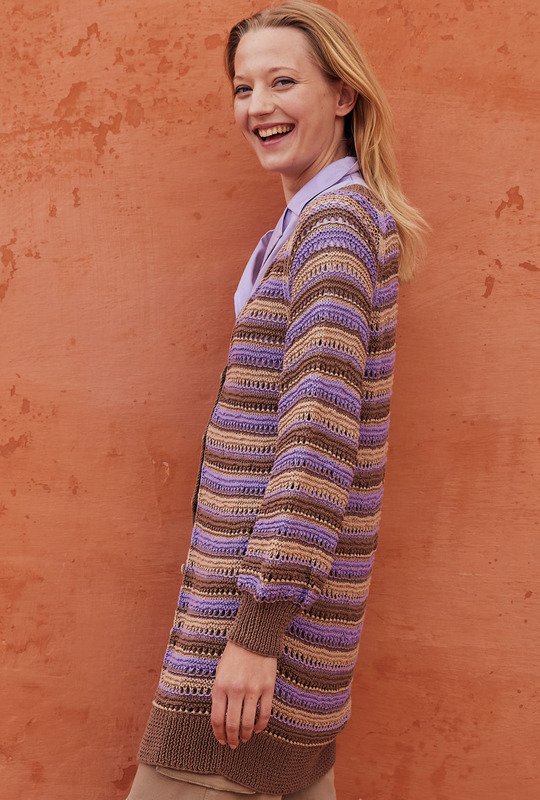 Schmal und hüftlang: Diese Longjacke aus Bio-Baumwolle macht im Frühling immer eine gute Figur. Das einfach zu strickende Streifenspiel mit Lochreihen lässt die Teile Stück für Stück wachsen und sorgt für Abwechslung. Du beendest die Arbeit mit einer gleichmäßigem Raglanschrägung, die zusätzlich durch schmale Glatt-rechts-Streifen akzentuiert wird. Zum Schluss noch die Verschlussblende anstricken und mit passenden Knöpfen ergänzen – fertig ist ein toller Begleiter, der lange deine Garderobe vervollständigt.