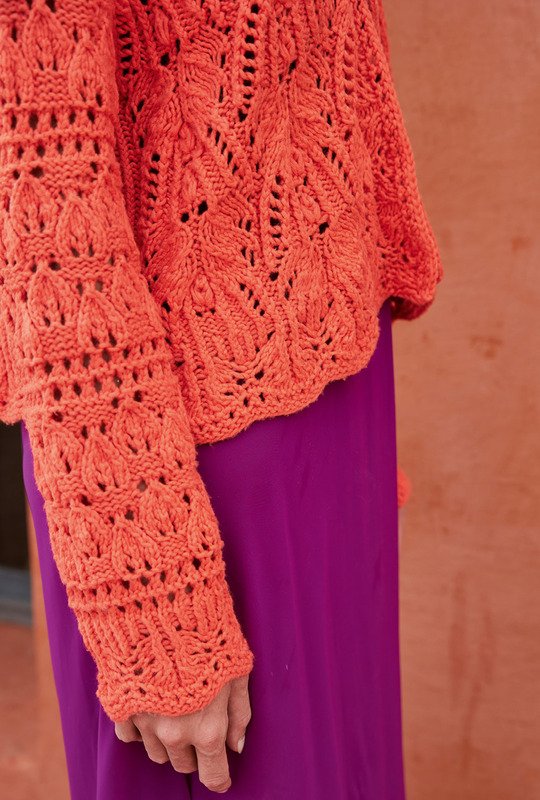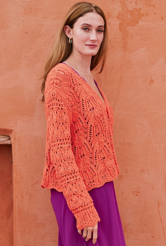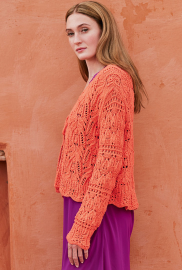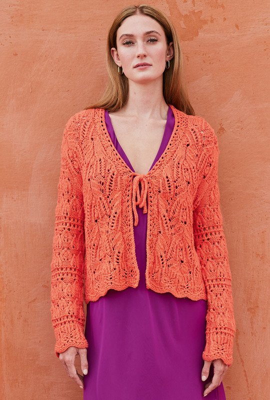 Die ausdrucksstarke Optik dieses Jäckchen entsteht durch die Kombination verschiedener Ajourstrukturen. Dafür gibt es in der Anleitung drei Strickschriften, die zur Orientierung dienen und für die man etwas Strickerfahrung aufweisen muss. Optimistische Aussagekraft hat das leuchtende Tomatenrot, durch das die Muster noch plastischer zur Geltung kommen. Die mit Lochreihen versehenen Blenden zieren die Vorderteil- und Halsausschnittkanten, Bindebänder in I-Cord-Technik bilden die Verschlusslösung. Alles in allem ein Kunstwerk, das Blicke auf sich zieht!
