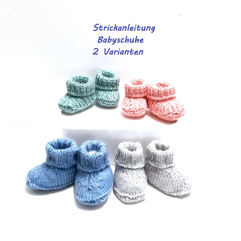 Angeboten wird eine Strickanleitung für Babyschuhe mit einer zusätzlichen Variante in PDF Format in deutscher Sprache.