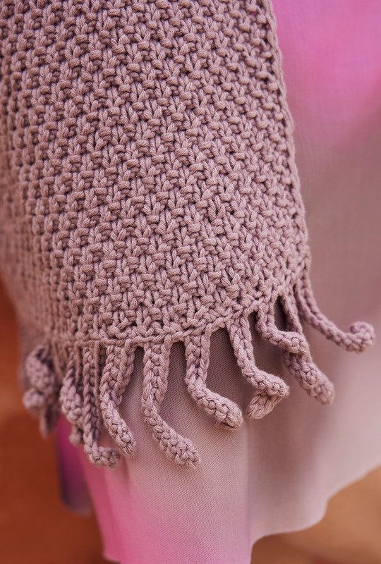 Schlichte Looks sind jetzt auf dem Vormarsch und sind gerade für Strickneulinge der perfekte Einstieg. Wie bei diesem knielangen Mantel, entstehen die Perlstrukturen aus rechten und linken Maschen und kommen auch bei den aufgesetzten Taschen zum Einsatz. Der schmale Rand der Vorderteile wird aus abgehobenen Randmaschen gebildet, die kettenförmig in Erscheinung treten. Aber auf ein schmückendes Detail haben wir nicht verzichtet: Den unteren Saum ziert eine Borte aus angehäkelten Fransen. Sehr hübsch!