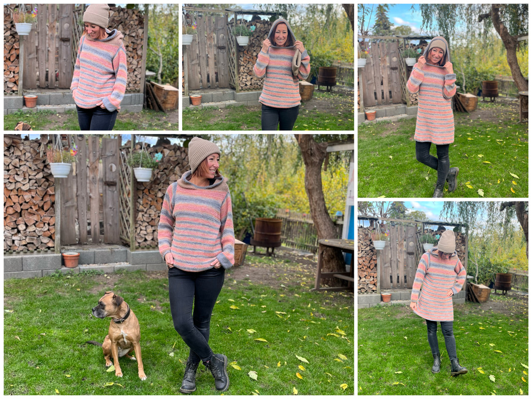 Dieser Hoodie kann als lange Version - als Häkelkleid oder kürzer - als Kapuzenpullover gehäkelt werden.