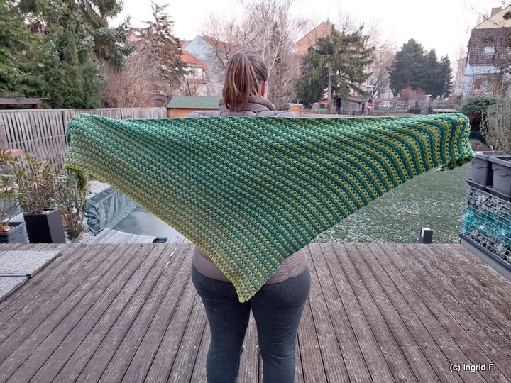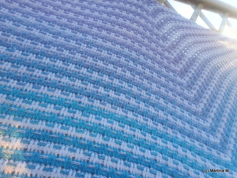 Ich habe zwei Bobbel, 4-fädig mit je 500 m verwendet. Dies ergab eine Größe von 168 x 45 cm.
