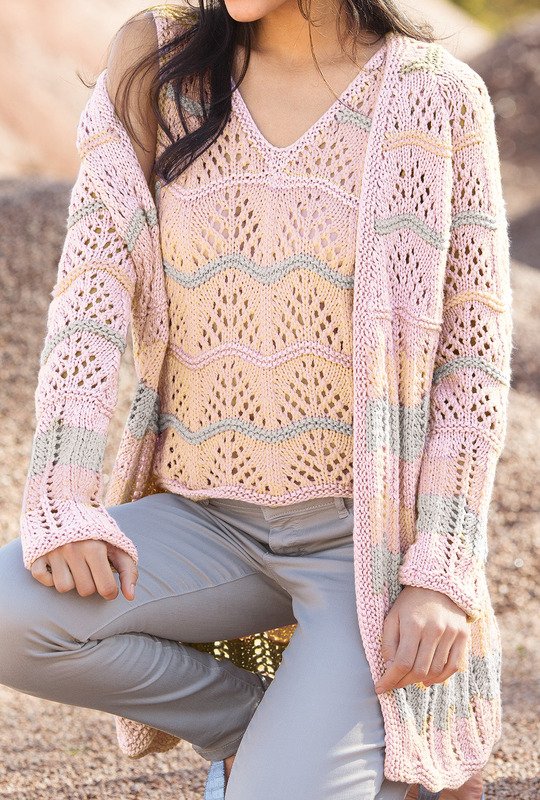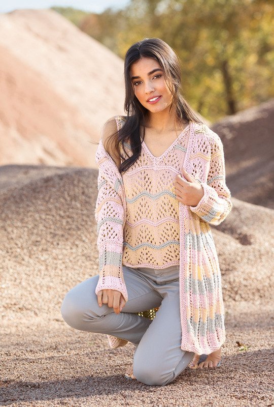 Tauchen Sie ein in die Eleganz unseres Twinsets – eine meisterhafte Kombination aus Langjacke und Top. Das verspielte Wellenmuster und zarte Querstreifen vereinen sich zu einem harmonischen Gesamtkunstwerk. Raffiniert kombiniert in verschiedenen Farbtönen entsteht eine unterschiedliche Querstreifen-Optik, die Frische und Eleganz miteinander vereint. Die raffinierte Kombination der Farben verleiht diesem Ensemble eine subtile Frische. Entdecken Sie das Spiel der Wellen und die erfrischende Lebendigkeit in jeder Nuance.