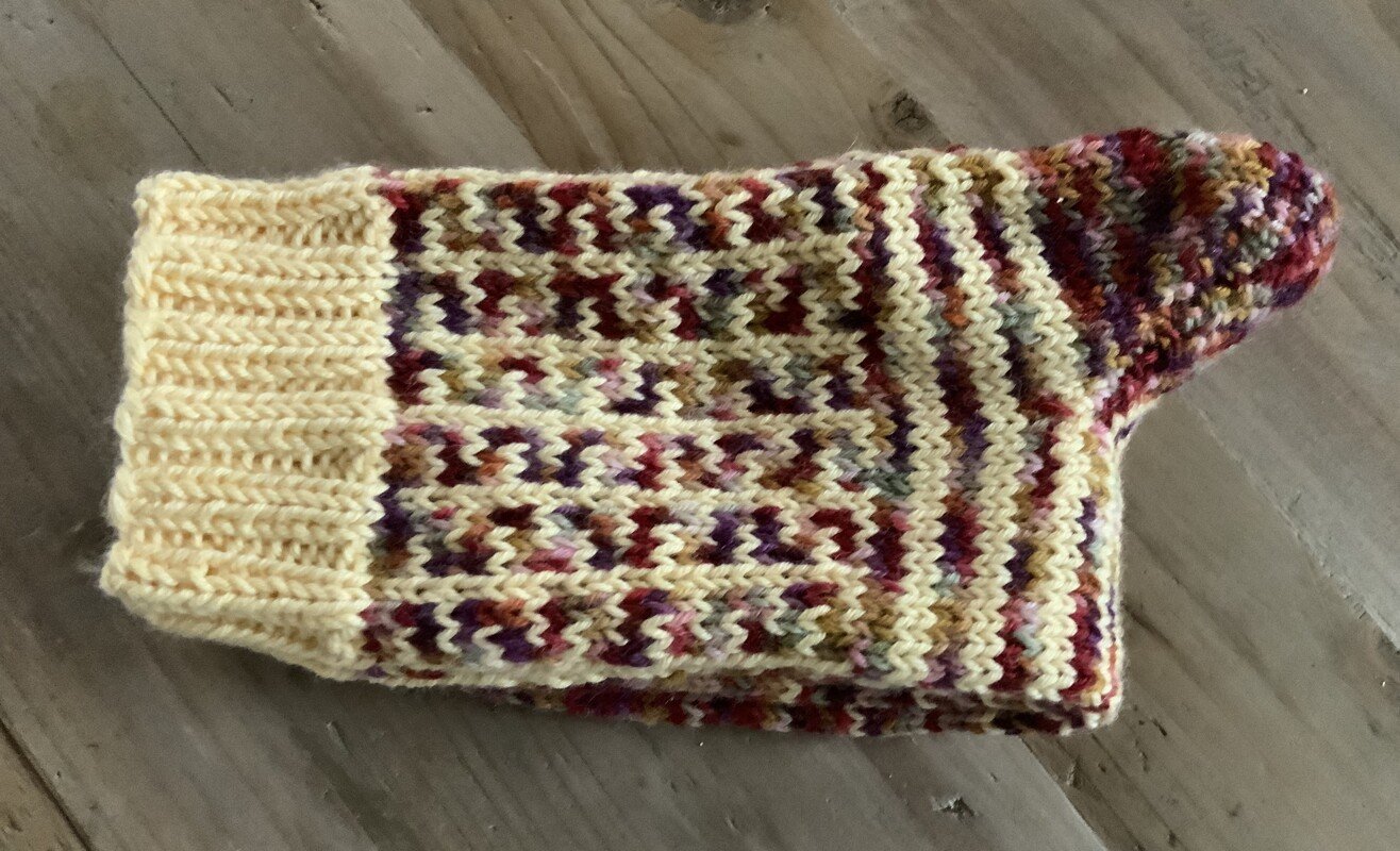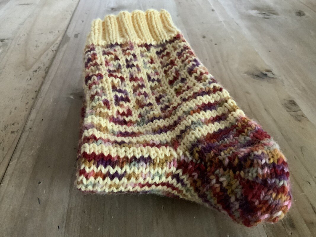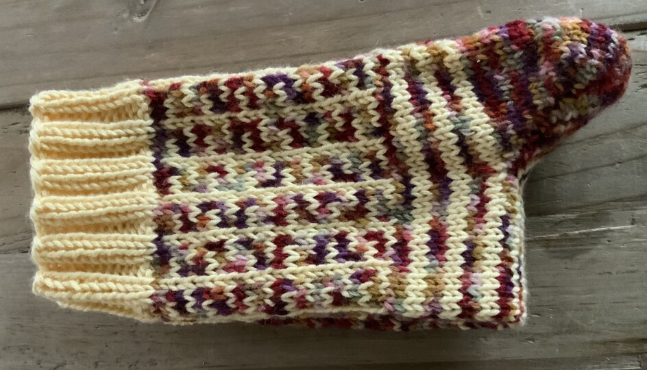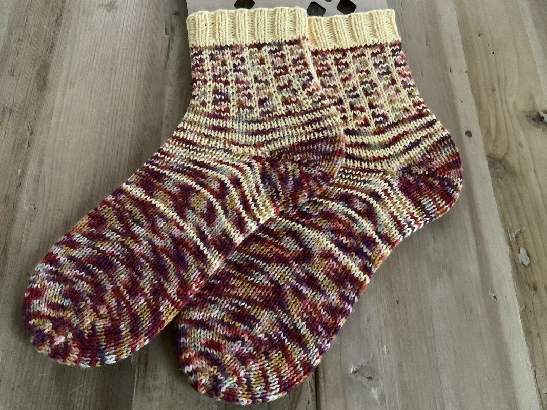 „Berthe“, ein Mix aus unifarbener und farbenfroher Wolle mit einem einfachen Fair-Isle-Muster am Sockenschaft. Die Socken werden von oben nach unten gestrickt. Ich habe die Ferse als Bumerangferse gearbeitet und eine Bandspitze gestrickt und beschrieben. Ferse und auch Spitze können jedoch auch anders ausgeführt werden.