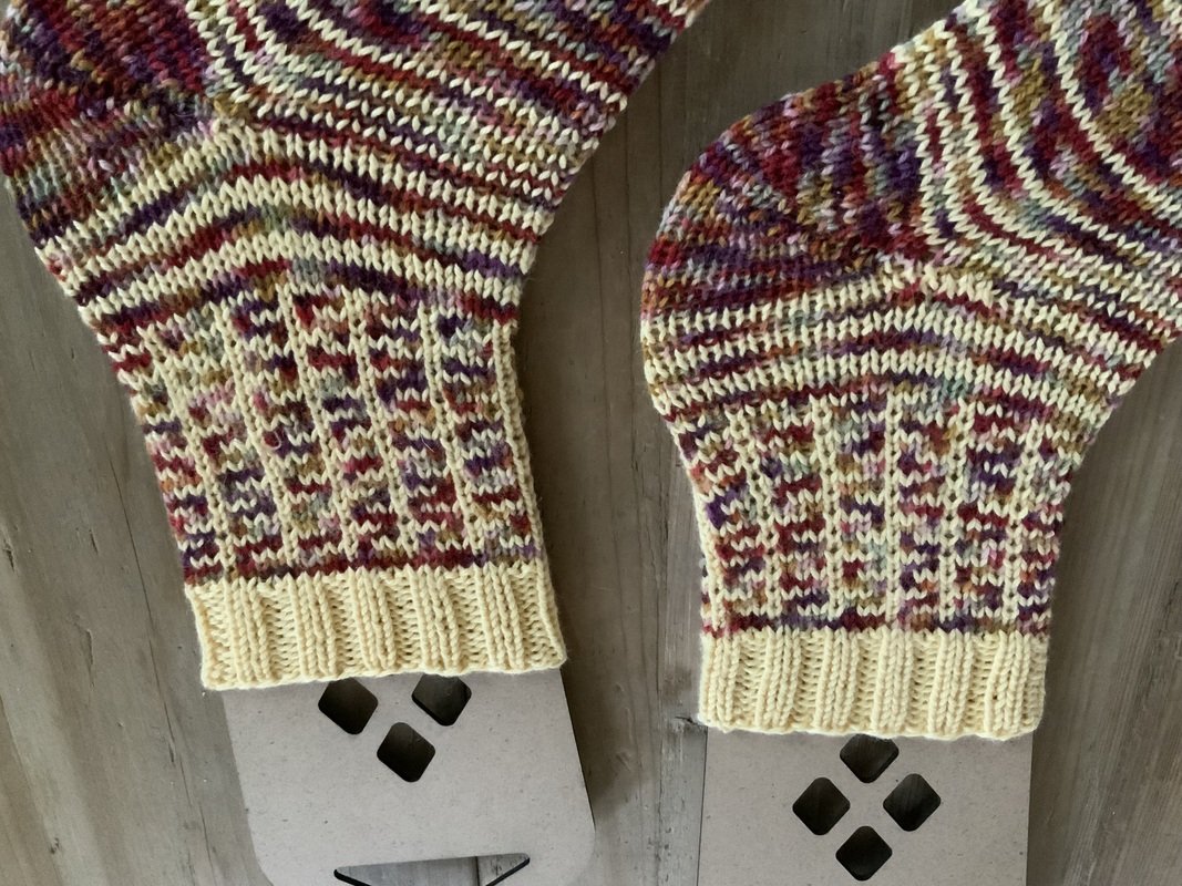 Mustersocken sind aus MYSOCKS PIXEL in der Farbe Nesu (bunt) kombiniert mit myboshi 50/50 in der Farbe Vanille (uni) gearbeitet.