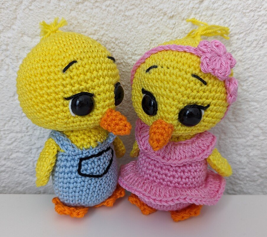 Mit dieser detaillierten Anleitung von 17 Seiten und vielen Bildern könnt ihr einen Jungen und ein Mädchenküken häkeln.