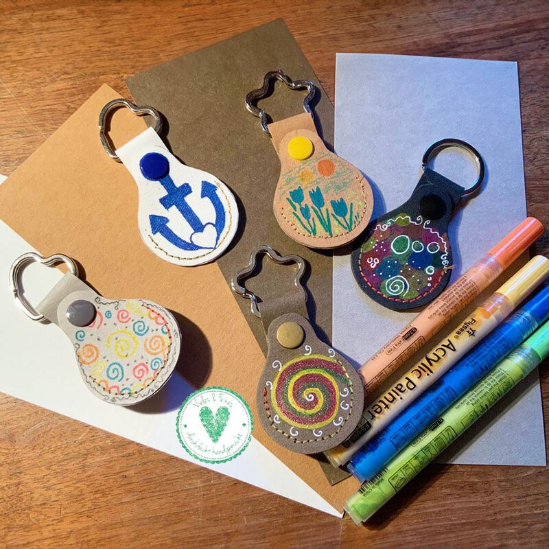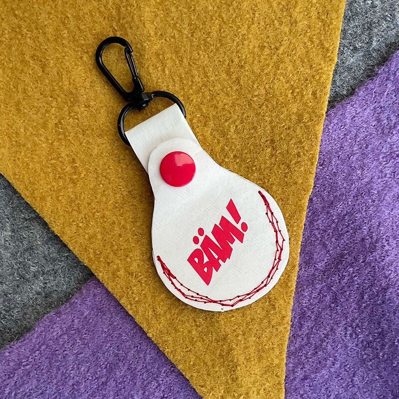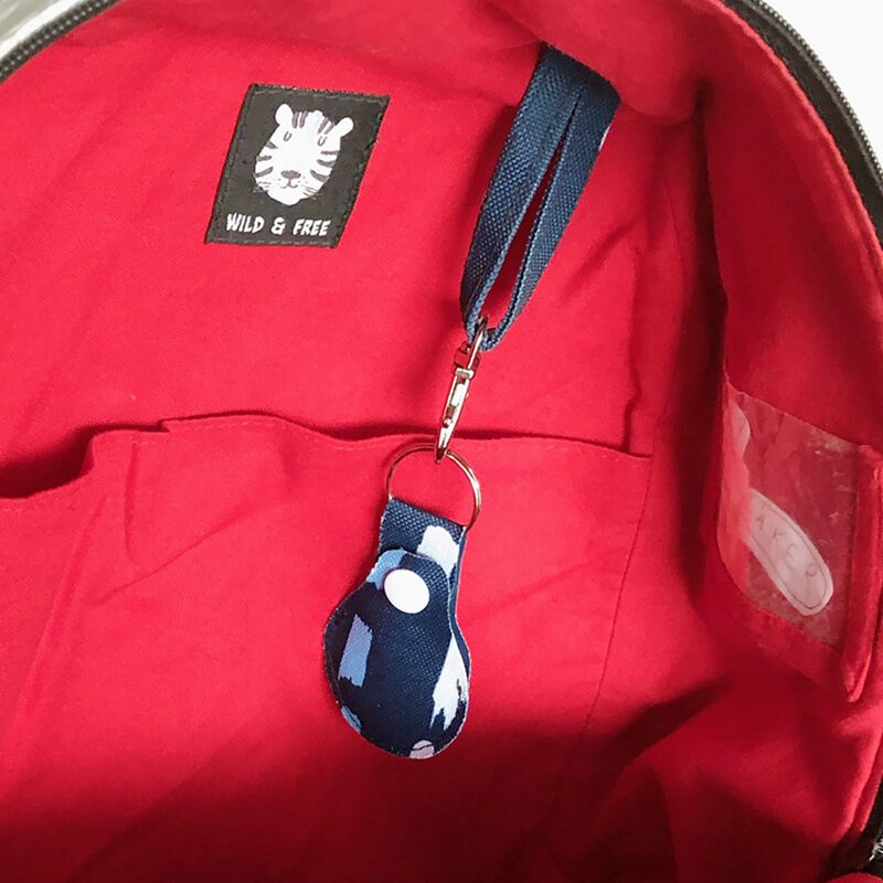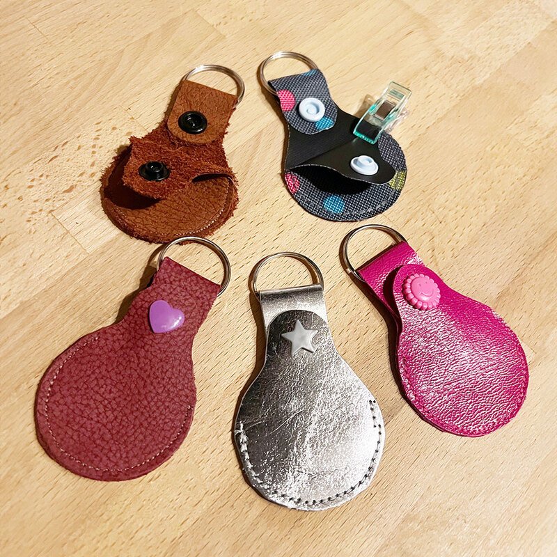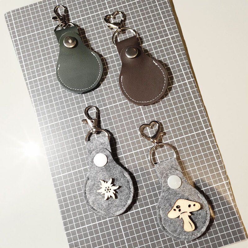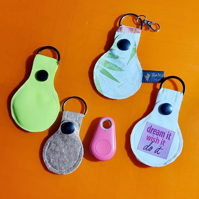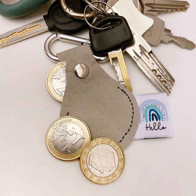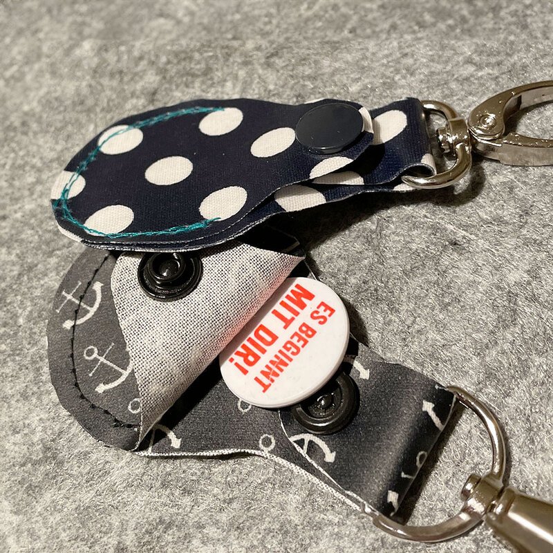 Nähanleitung und Schnittmuster gestaltet als PDF-E-Book für einen Taschen- und Schlüsselanhänger mit kleiner Tasche für AirTags, Einkaufswagenchips oder Kleingeld.