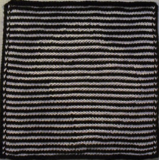 Benötigt wird Baumwollgarn in zwei Farben, gesamt ca. 40 Gramm, Nadelstärke 2 1/2 oder 3, je nach Material und Strickweise, es muß sehr fest gestrickt werden!