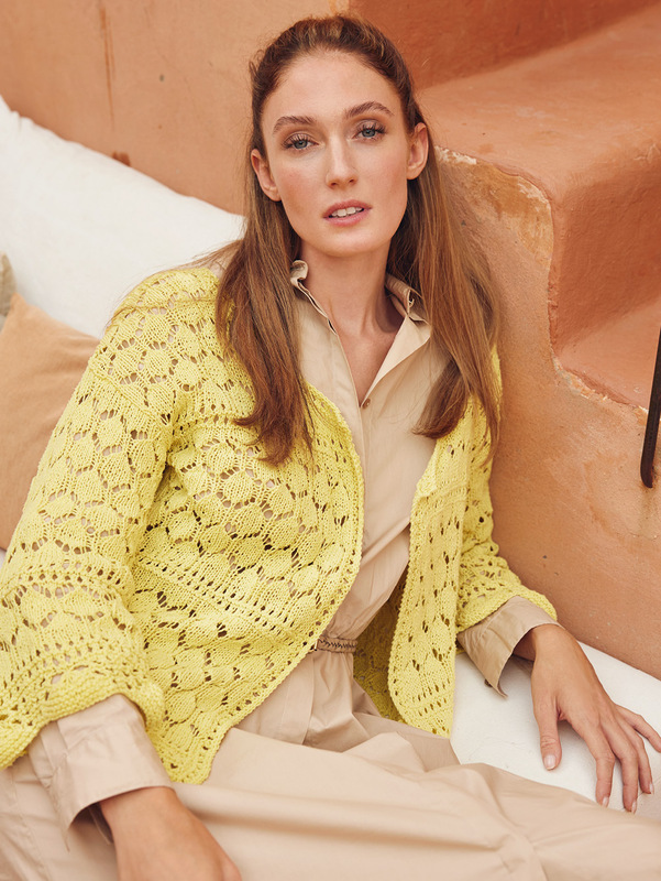 Ajourrauten und Lochreihen im Wechsel, dazu eine leicht gewellte Saumkante – fertig ist ein toller Frühjahrsbegleiter, der sich hier verschlusslos zeigt. Wer Knöpfe bervorzugt, kein Problem: Sie passen wunderbar durch die Löcher der schmalen Vorderteilblende. Das Jäckchen entsteht aus recycelter Naturseide, die eine matte matte Oberfläche aufweist und jedem Gestrick ein superweiches Tragegefühl verleiht, da es sich geschmeidig, soft und kühl anfühlt. Fazit: ein klares Statement für Nachhaltigkeit und Komfort.