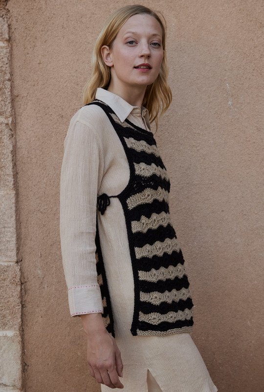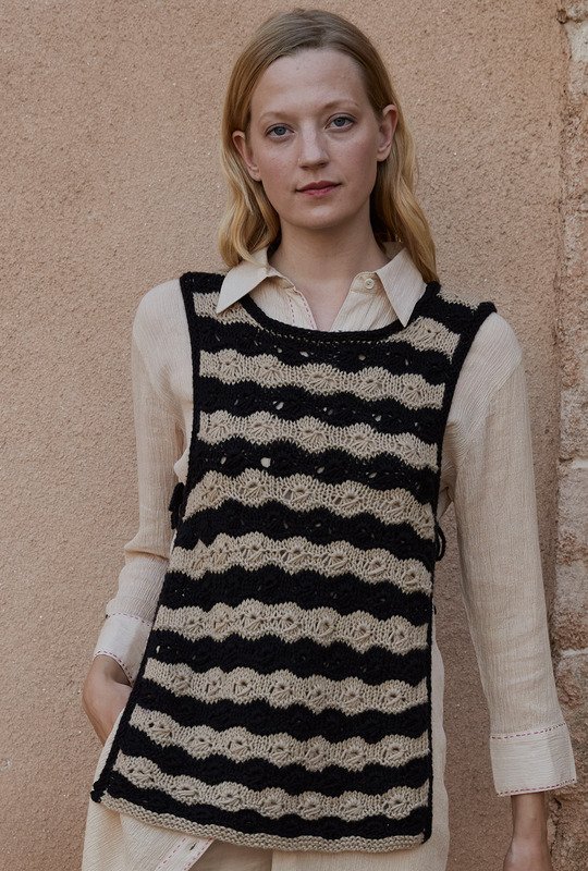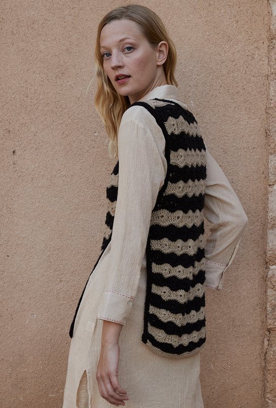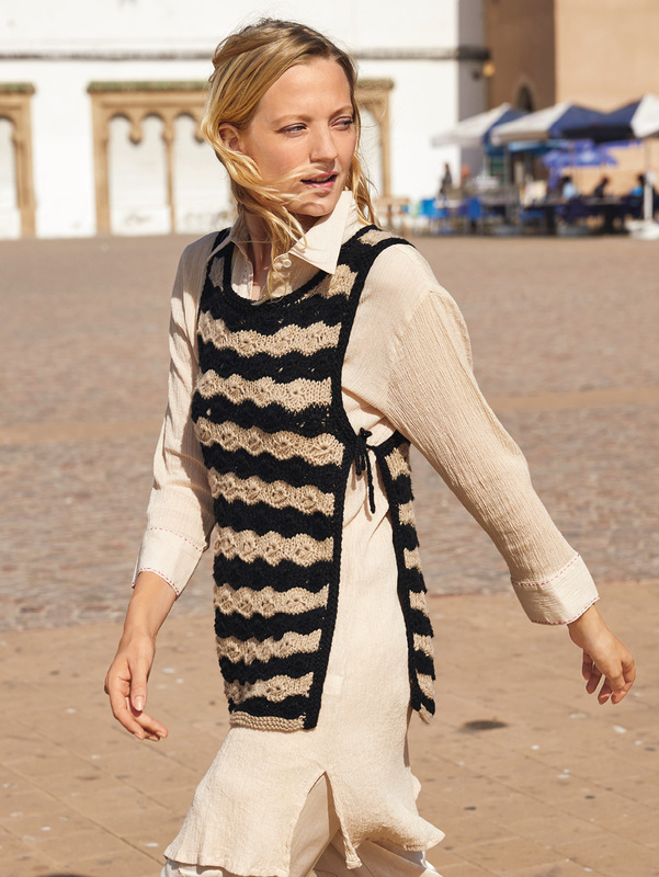 Über Blusen, Longsleeves oder Kleidern – dieser Pullunder macht einfach alles mit. Schwarz und Creme bilden in gleichmäßiger Streifenfolge einen tollen Kontrast. Die Wellenoptik entsteht durch ein Fantasiemuster, bei dem Maschen abgehoben und zusammgenstrickt werden. Das ist etwas kniffelig, deshalb raten wir zu einer kleinen Maschenprobe. Für jede Menge Bewegungsfreiheit sorgen die offenen Seitenkanten, die lediglich durch Bindebänder unter den Ärmeln zusammengehalten werden.