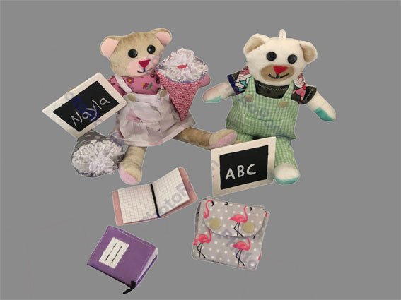 und ausziehen mit. Für das Mädchen einen Slip, ein T-Shirt und einen Latzrock. Für den Jungen eine Boxershort, ein T-Shirt und eine Latzhose. Außerdem hat der Teddy noch einen Ranzen den man öffnen kann und in dem sogar ein kleines Schulheft mit drin ist. Zusätzlich hat er noch eine Schultüte die man ebenfalls befüllen kann. In der