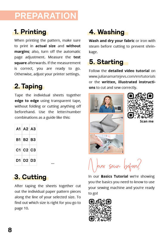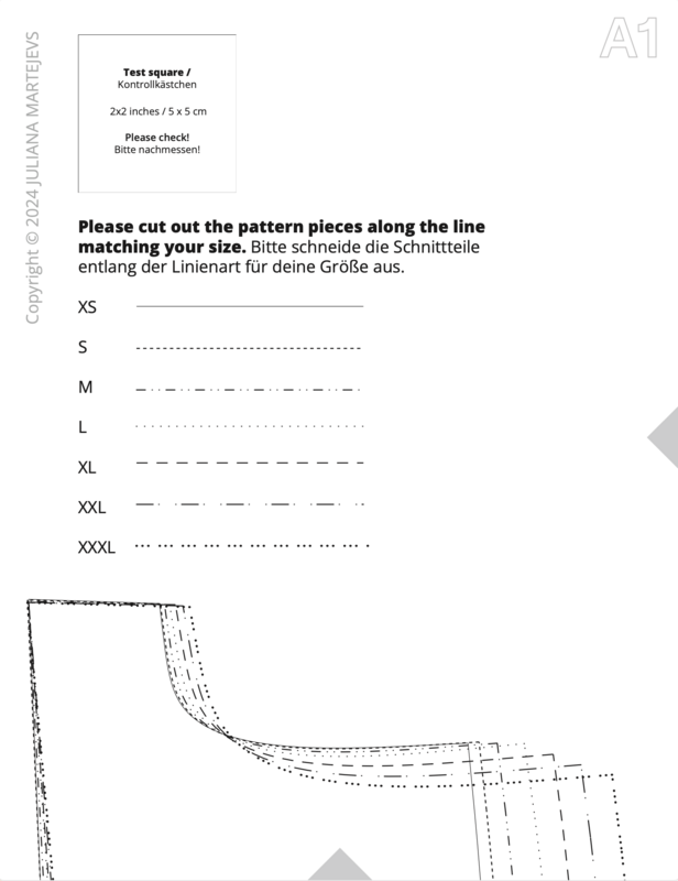 Die Größen XS-XXXL sind als Schnittmuster enthalten. Die genauen Maße der Größen könnt ihr der Größentabelle in den Bildern entnehmen. Als Referenz: Unser Model Naomi ist 170cm groß und trägt Größe S. Unser Model Freia ist 173cm groß und trägt Größe XXL.