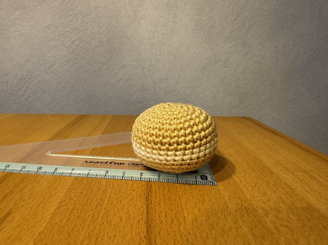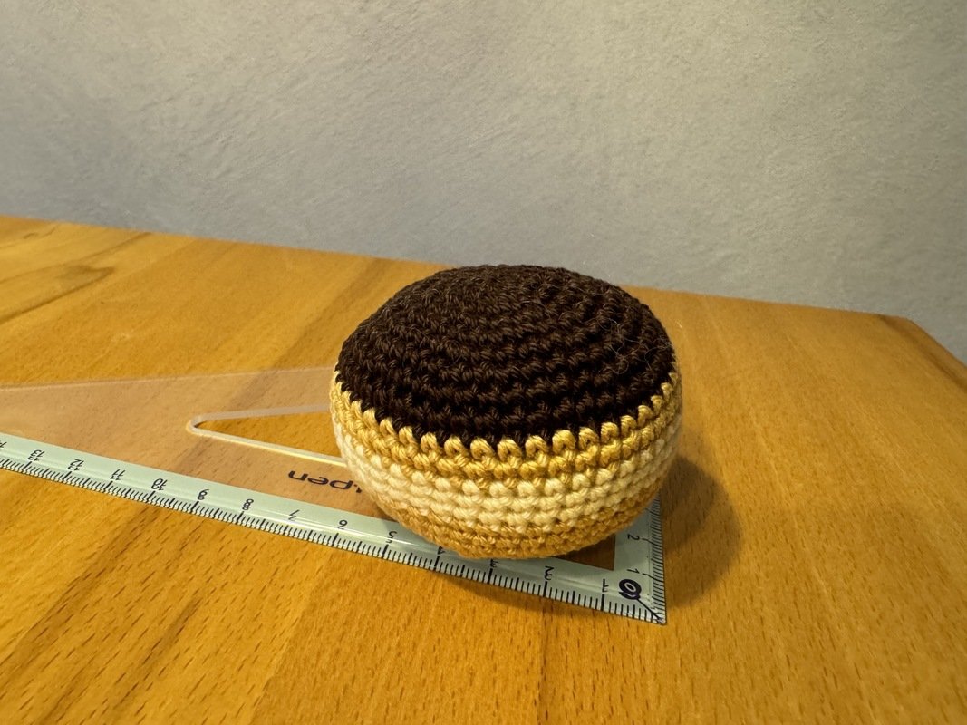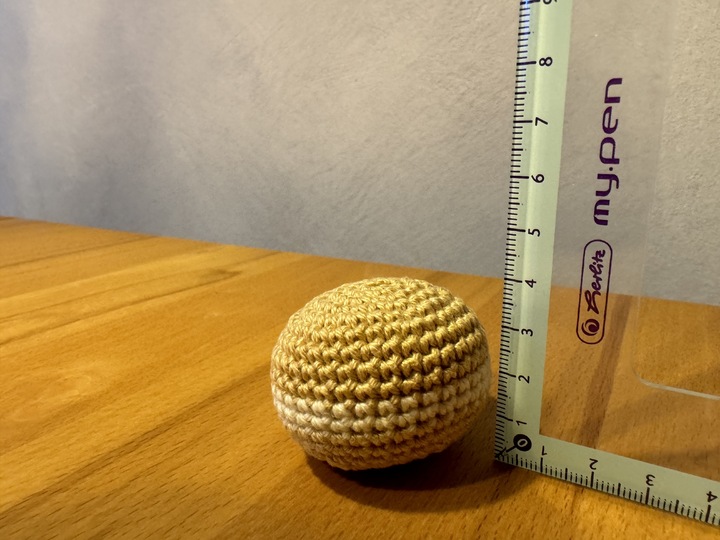 Meine Berliner wurden in der kleinen Variante 5 cm im Durchmesser und 3,5 cm hoch, die große Ausführung 6,5 cm im Durchmesser und 4,5 cm hoch. Siehe gern in den Bilder nach, hier liegen die fertige Häkelteile auf dem Maßband um einen Anhalt zu geben