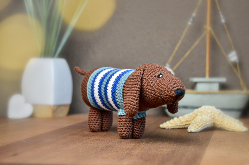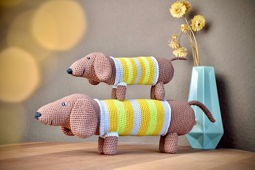 Häkel dir deinen eigenen Dagobert. Mit dieser Anleitung kannst du dir einen süßen Dackel im Pullover häkeln. Dabei kannst du deiner Kreativität freien Lauf lassen. Vielleicht nimmst du andere Farben für den Pulli?! Oder du machst ihn mit anderer Wolle oder Nadelstärke etwas größer oder kleiner. Die Welt der Amigurumi kennt da keine Grenzen. Probiere es einfach aus, ich bin mir sicher du wirst Spaß haben. Und am Ende sogar ein süßes Geschenk für eine schwangere Freundin oder einen Dackelfan?!