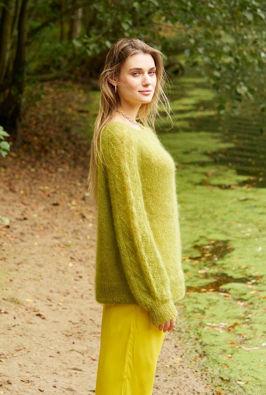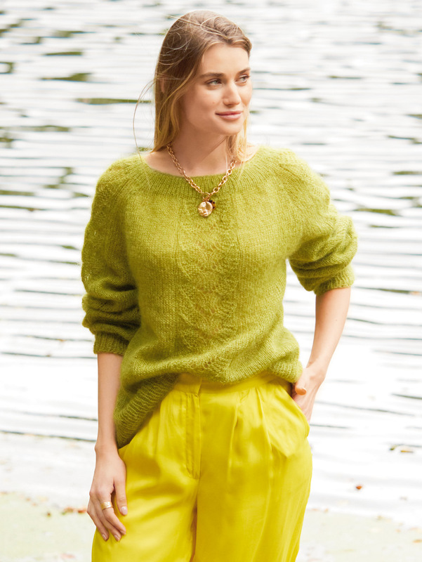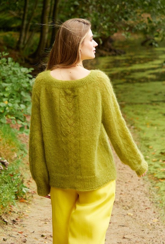 Dieser zweifädig gestrickte, lässige Raglanpulli liebt das Understatement. Der breite Ajourmusterstreifen in der Mitte von Vorder-, Rückenteil und Ärmeln verziert den ansonsten schlicht glatt rechts gestrickten Pulli, sodass das herrlich flauschige Garn aus einem Mohair-Seiden-Gemisch ganz im Mittelpunkt stehen kann. Das Stricken des Raglans ist anfängerleicht, da für den Halsausschnitt keine Abnahmen gemacht werden müssen. Am Ende werden alle Maschen auf eine Rundstricknadel genommen und eine doppelte Rippenblende angestrickt; auch die Bündchen bestehen aus Rippen. Die Anleitung hierfür gibt es in den Größen 38/40, 42/44 und 46/48.