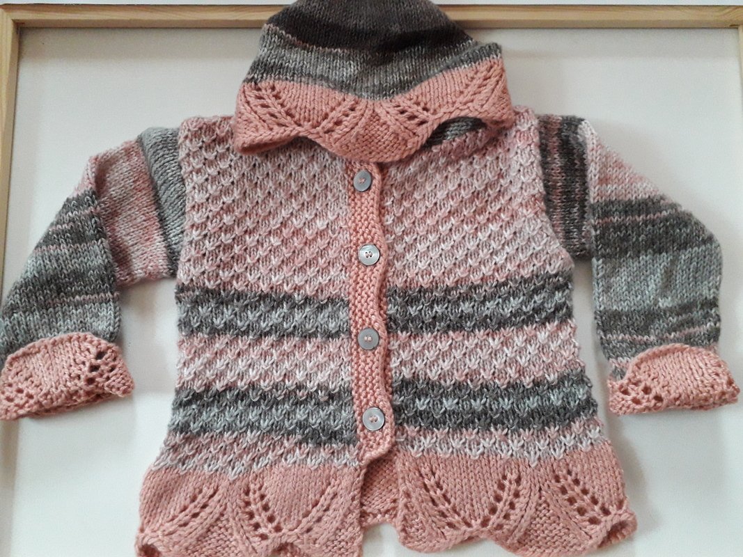 Hier bekommst du eine bis ins kleinste Detail erklärte 12-seitige Strickanleitung in deutsch für eine süße Mädchenjacke mit Kapuze aus Farbverlaufswolle mit einfarbigen Kontrasten am Bund, an den Ärmeln und an der Kapuze. Natürlich kann die Jacke genau so gut mit einfarbiger Wolle gestrickt werden. Die Jacke ist in Größe 110/116 gestrickt und passend für 4-5 Jahre. Die Jacke besteht aus mehreren Mustern, welche natürlich in der Anleitung genauestens erklärt werden. Mit der Kapuze sieht die Jacke sehr flott aus und hält Ihren Schatz in der Übergangszeit warm. Die Weste ist aus Mischwolle gestrickt und daher pflegeleicht. Ideal für kühlere Sommertage und passt perfekt zur Jeans, zur Leggings oder zu einem hübschen Kleid. Ihr kleiner Schatz wird bestimmt viele Blicke auf sich ziehen, wenn sie diese Jacke trägt.