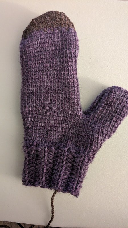 Zuerst wird das Bündchen “konventionell” in halben Stäbchen gearbeitet. Anschließend wird die Arbeit um 90° gedreht und weiter tunesisch gehäkelt. Danach wird der Teil des Fäustlings zwischen Handgelenk und Daumen gehäkelt. Anschließend beide Hälften des Daumens. Danach wird der Handbereich und anschließend der Fingerbereich gehäkelt.