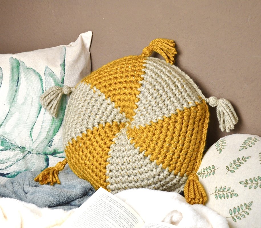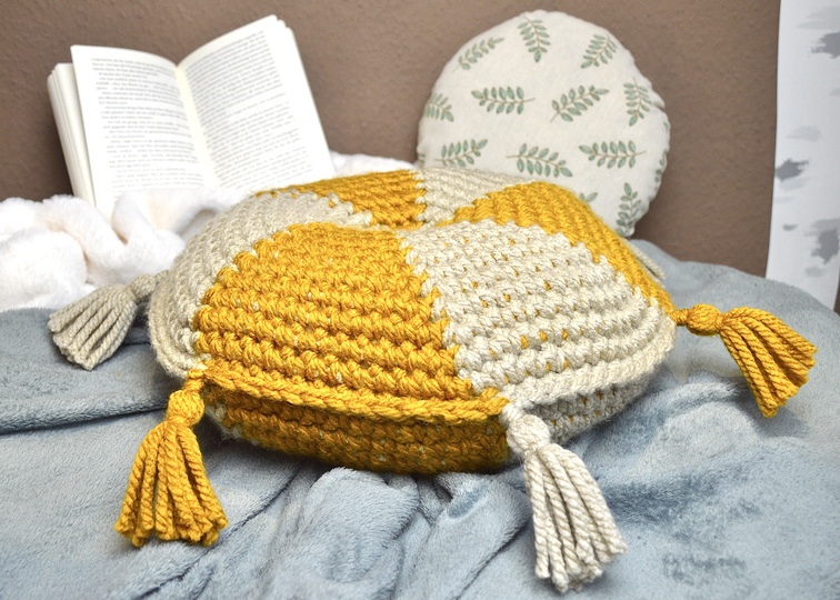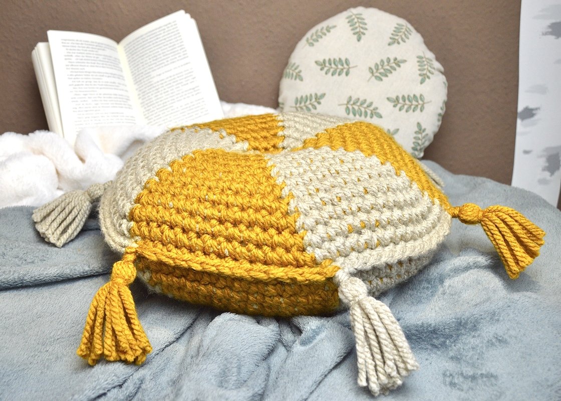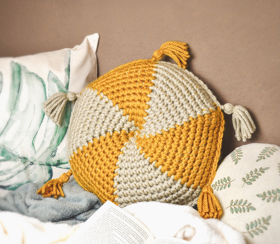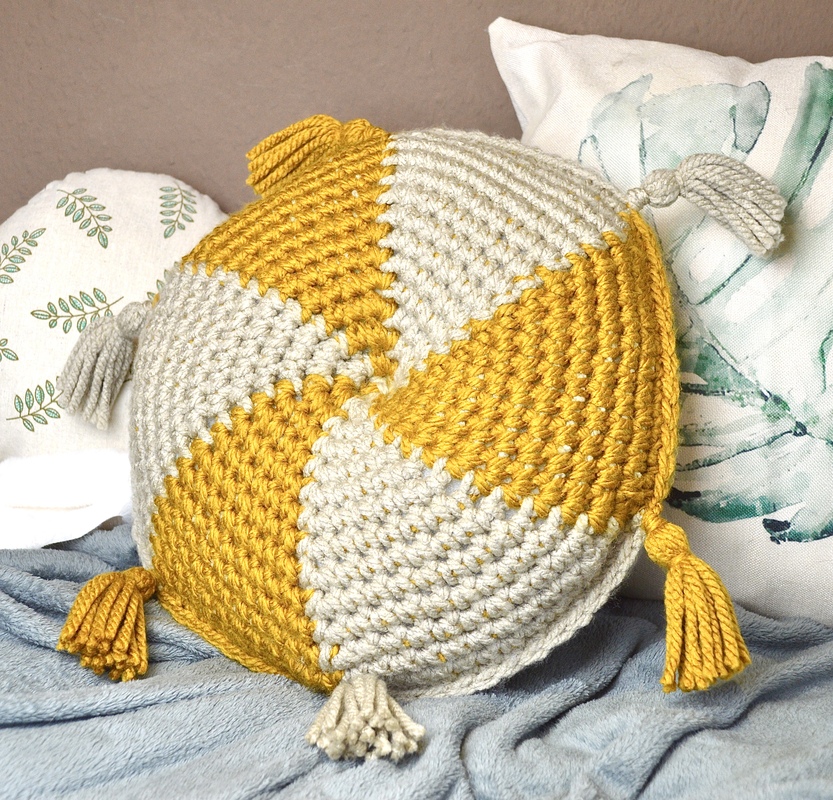Spiralförmig wechseln sich die beiden Farben Senfgelb und Beige ab. Dieses runde Häkelkissen ist der Blickfang in jedem Zimmer. Ob im Kinderzimmer oder Wohnzimmer, durch seine warmen Naturfarben und den Quasten fällt es sofort auf. Doch es ist nicht nur stylisch, sondern auch bequem und sogar praktisch. Denn du kannst es auch als Yogakissen oder Stuhlkissen benutzen.