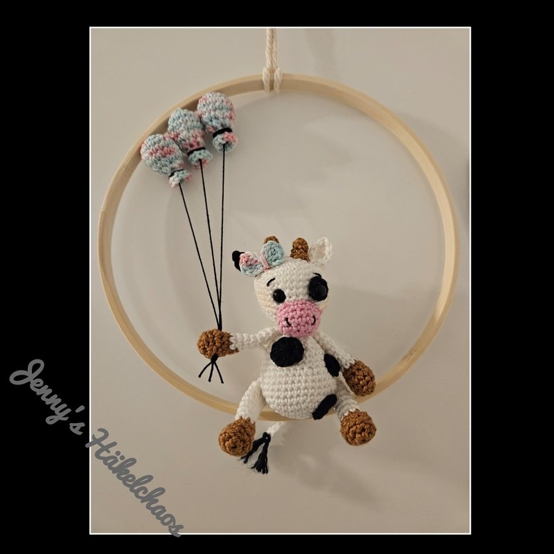 Eine Häkelanleitung zum nacharbeiten für eine kleine Kuh mit Schleife und Luftballons.