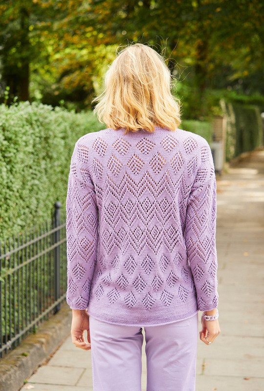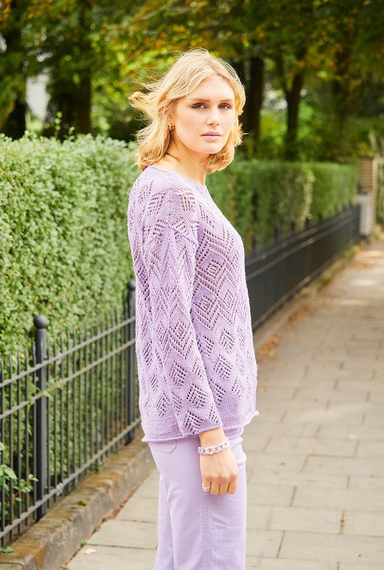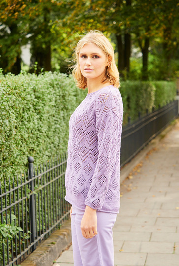 Dieser Pulli lebt von seiner spannenden Anordnung unterschiedlicher Ajourmuster. Der untere Rand wirkt ruhig und ist glatt rechts gestrickt, dann folgt das Muster in Rautenform, in der Mitte das zackige Muster und danach nochmal die Rauten – überaus spannend zu stricken. Der flache, runde Halsausschnitt wird am Ende mit je 1 Runde fester Maschen und Krebsmaschen umhäkelt. Das Modell aus fliederfarbenem Baumwollgarn mit wenig Polyester-Anteil ist ganz gerade geschnitten, die Ärmel werden nach oben hin weiter. Eine Anleitung steht für die Größen 36/38, 42/44 und 48/50 zur Verfügung.
