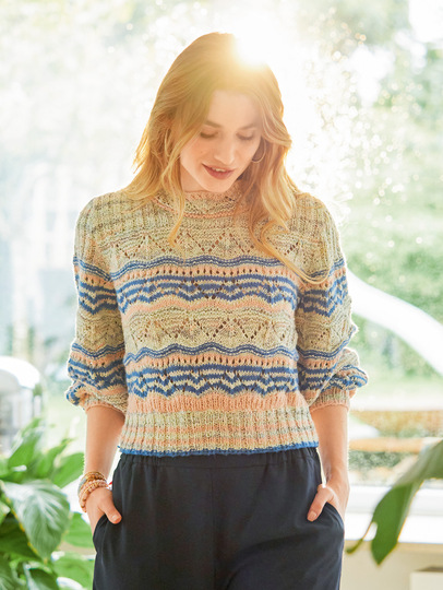 Bei diesem Pullover spielt der abwechslungsreiche Mix aus Ajour- und Rippenmustern sowie glatt rechts und Lochmuster die Hauptrolle. Gearbeitet wird mit einem Farbverlaufsgarn in pastelliger Muschelfarbe, die neben den kraftvollen Unitönen in Puder und Jeansblau für eine dezent-feminine Note sorgt. Die Musterkombi kommt nochmal beim Kragen zum Einsatz. Ärmel mit Armkugel garantieren den perfekten Sitz an den Schultern. Zweierlei Garne – einmal Ökobaumwolle mit wenig Polyamid, einmal reine Baumwolle sorgen für ein angenehmes Tragegefühl. Die Anleitung kann für die Größen 36/38, 42/44 und 48/50 downgeloadet werden.