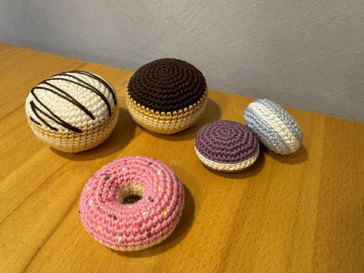 Ausführliche Anleitung zum Erstellen von gehäkelten Berlinern, Donuts und Macarons, geeignet für den Kaufladen, die Spielküche oder als Deko für die Küche.