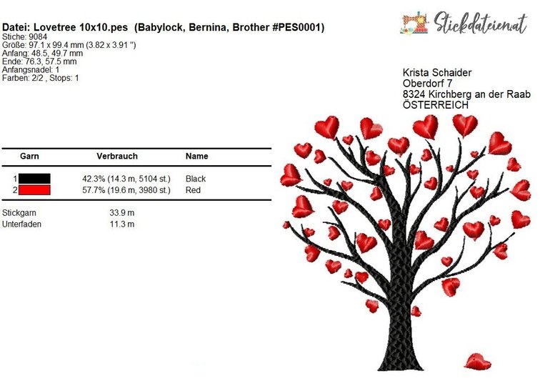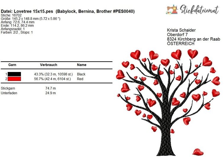 Digitale Stickdatei: Baum mit roten Herzblättern ️
