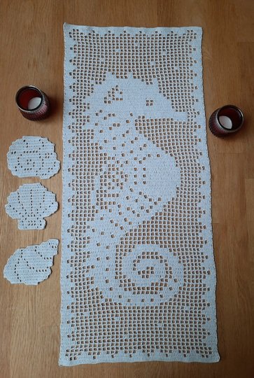 Häkelanleitung für das Deckchen Seepferdchen und 3 Untersetzern Muschel