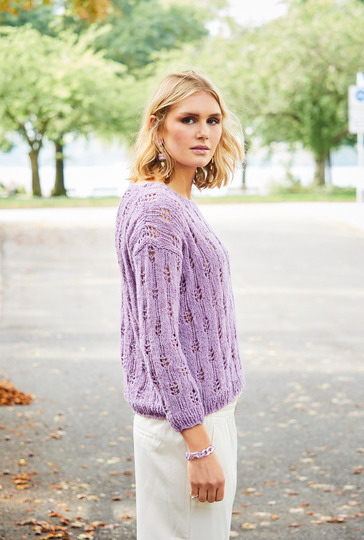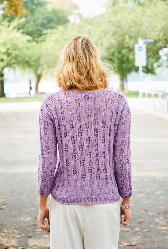 Für diesen überaus weichen Pullover werden zwei Garne – einmal reine Seide in Lila, einmal ein Schurwolle-Alpaka-Seide-Mischgarn in Helllila zusammen verstrickt. Durch das zarte Lochmuster zwischen den glatt rechten Längsstreifen bekommt der Pulli eine reliefartige, dreidimensionale Struktur. Alle Bündchen und die Ausschnittblende sind in einem Rippenmuster kombiniert mit Hebemaschen gearbeitet. Der Schnitt ist ganz gerade, mit einem runden Halsausschnitt. Gerade eingesetzte Ärmel ergeben überfallende Schultern. Eine Anleitung für dieses Modell kann für die Größen 36/38 und 40/42 sowie 44/46 downgeloadet werden.