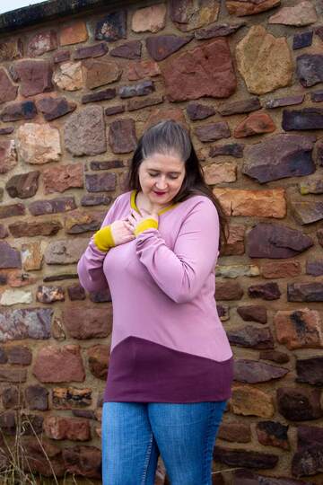 Dieser Schnitt für einen Pullover mit Rundhalsausschnitt der Richtung U-Boot-Ausschnitt geht, Ärmelbündchen mit und ohne Knopfleiste und eine asymmetrische und eine symmetrische Spitze im Vorderteil und dessen Saumbündchen, trägt den schönen Namen "Gipfel der Gemütlichkeit".