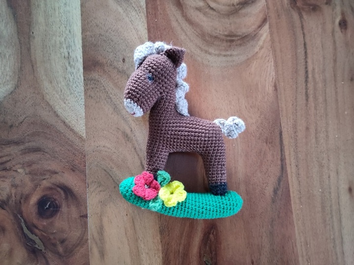 Material: je 1 Knäuel braunes, weißes oder welche Farbe auch immer dein Schaukelpferd haben soll und grünes