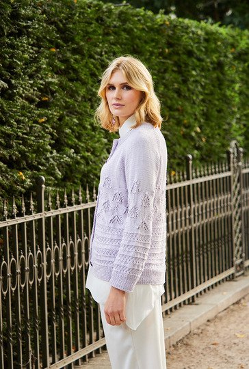 Ein Leckerbissen für alle versierten StrickerInnen, denen einfaches geradeausstricken zu eintönig ist. Bei dieser Jacke mit einem spannenden Mustermix aus abgehobenen Maschen, langgezogenen Maschen, die verkreuzt werden, Ajour- oder Patentmuster kommen Strickenthusiasten auf ihre Kosten. Die betonten Abnahmen an den Raglanschrägungen und die in Doubleface gestrickte Ausschnittblende tun ihr Übriges. Die Knopfblende ist im Halbpatent gearbeitet; zum Anschlagen der Maschen gibt es einen doppelten Kreuzanschlag. Alle Bündchen sind im 1/1-Rippenmuster gearbeitet. Das Garn ist aus reiner Öko-Baumwolle. Eine Anleitung hierzu kann für die Größen 36/38 und 44/46 downgeloadet werden.