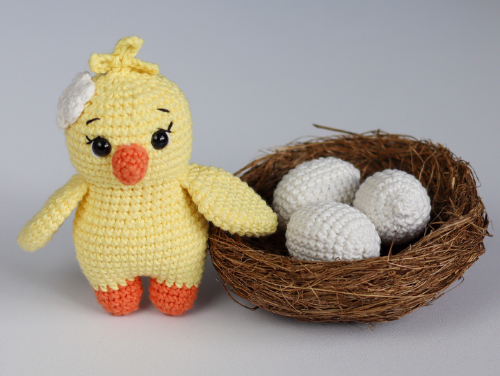 Dies ist eine digitale, deutschsprachige Häkelanleitung für ein kleines Osterküken. Das Küken kann in 3 Varianten gehäkelt werden: Ohne Kopfbedeckung, mit Eierschale und Blüte oder mit Hasenohren. Die kleinen Ostereier gehören außerdem zur Anleitung.
