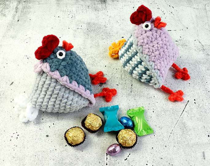 Nun gibt es die beliebten befüllbaren Hühner auch in groß. Schnell gehäkelt mit dicker Chenillewolle hat es genau die richtige Größe für ein paar Ostersüßigkeiten. Natürlich kannst du auch Geiheimbotschaften, Geld, Gutscheine, Schmuckstücke, ein Seidentuch, eine Krawatte, Socken oder sonstige Kleinigkeiten darin verstecken und verschenken.