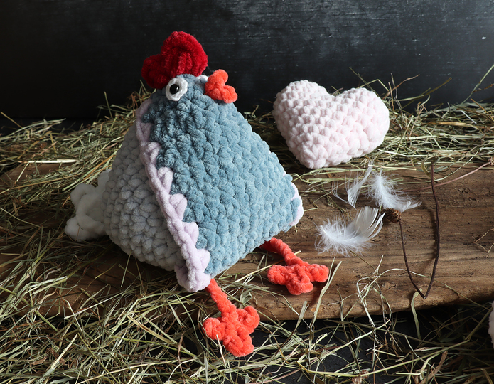 Ei wunderbares Wochenend- ober Abendprojekt. Der Körper wird mit festen Maschen gehäkelt, die Schwanzfedern und der Kamm werden direkt an den Körper gehäkelt. Die Beinchen sind zusammenhängend und werden mit eingearbeitet. So musst du am Ende lediglich den Schnabel anbringen und eine Naht schließen, ansonsten ist kein Annähen nötig (außer 1 Knopf).