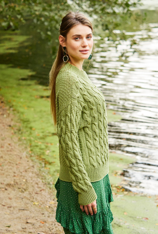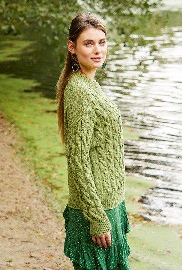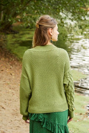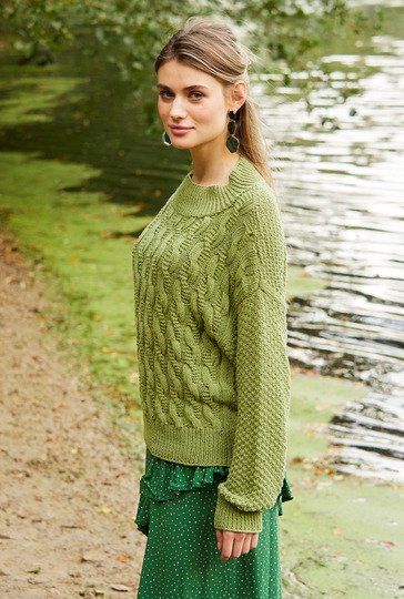 Interessant ist hier nicht nur die Verteilung der grundverschiedenen Muster, es ist auch das fantasievolle Zopfmuster im Vorderteil und an einem Ärmel. Am Rückenteil und am anderen Ärmel ist ein kleines Schachbrettmuster zu erkennen. Flankiert werden die Muster an den Seitenlinien durch glatt rechts. Die Bündchen und die breite Halsausschnittblende sind als 1/1-Rippen gearbeitet. Weite Ärmel und weit überfallende Schulterpartien passen ausgezeichnet zu diesem Oversize-Pulli. Das Baumwolle-Polyacryl-Mischgarn in Moosgrün kann problemlos in der Waschmaschine gewaschen werden. Eine Anleitung gibt es für die Größen 38/40, 42/44 und 46/48.
