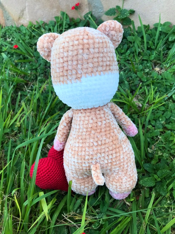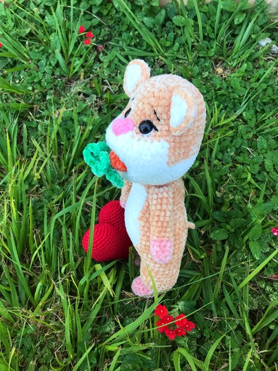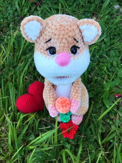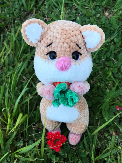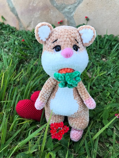 Die Größe von Fluffy ist von den Materialien, die du verwendest und deiner Häkelweise, abhängig. Ich habe bei der Anleitung ein etwas dünneres Chenillegarn verwendet und der Hamster ist etwa 26 cm groß.