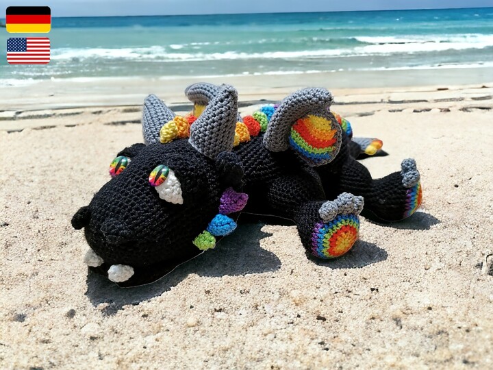 Der Fertige Drache wird ca. 36cm. Natürlich kann die Größe variieren, je nachdem ob man fest oder locker häkelt. Auch die Wahl der Wolle ist entscheidend. Ich selbst häkle mit Baumwollgarn 125m/50g (100% Baumwolle).
