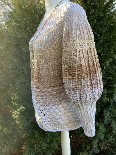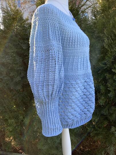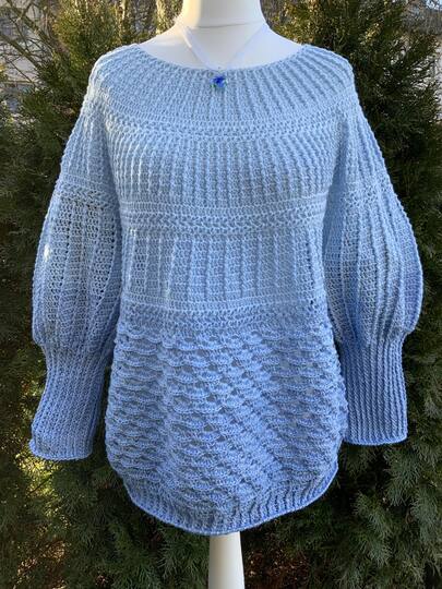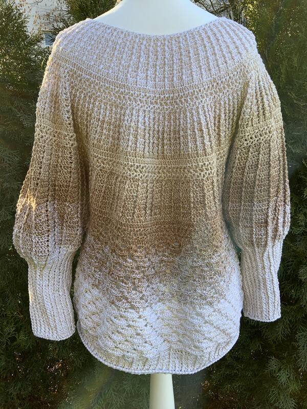 Er wird mit Rundpasse ohne Naht von oben nach unten gehäkelt.