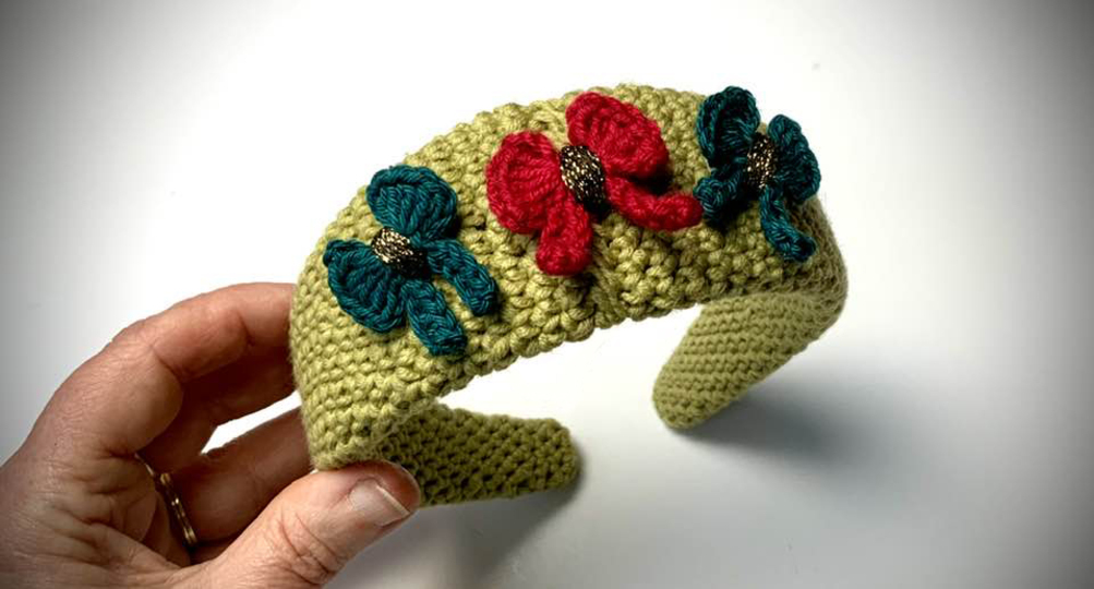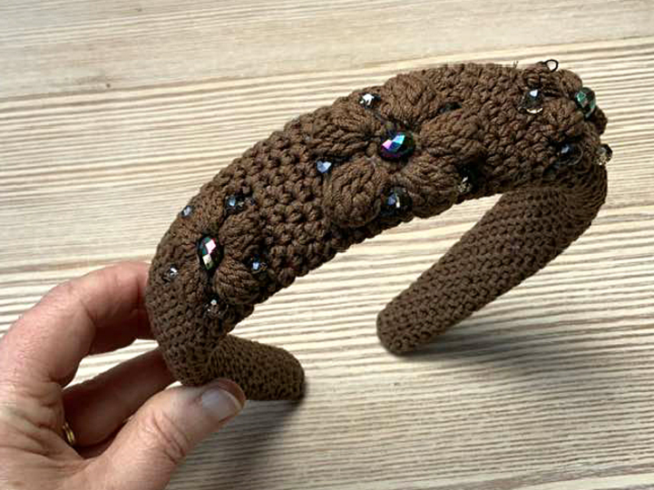 Der gehäkelter Haarreif sitzt durch das gehäkelte Gewebe prima auf dem Kopf.