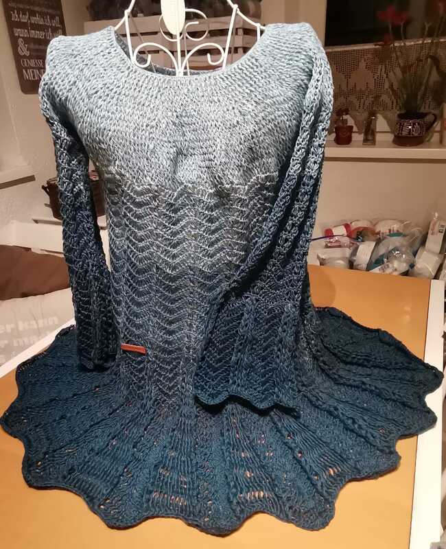 Für Größe S 1 x Bobbel 3 fädig 800 m und 2 Ärmelbobbel zu je 300 m oder 2 x 3 fädig, 800 m (wenn du den Farbverlauf der Ärmel exakt denen des Körperteils anpassen möchtest) von Verbobbelt.at,