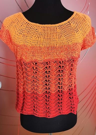 Er wird mit Rundpasse von oben in einem Stück gehäkelt und ist so ganz einfach an jede gewünschte Größe anpassbar. Die Ärmel werden extra direkt angehäkelt.