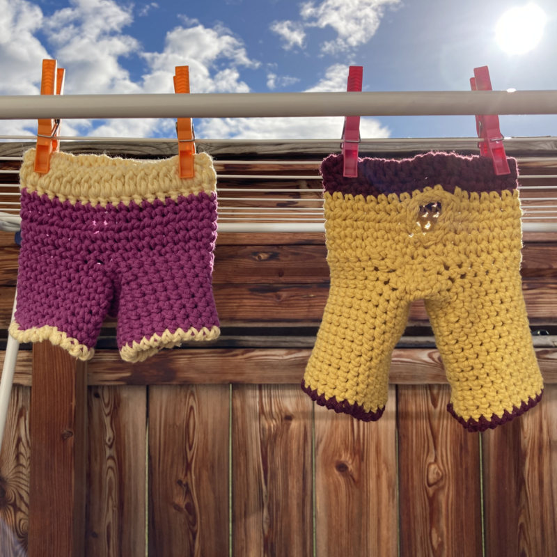 Kleide deine Fashion Friends ein! Mit dieser Anleitung eine praktische Hose (wahlweise eine lange oder kurze Hose) häkeln, welche auf der Rückseite ein kleines Loch hat, durch das das Schwanzerl der Fashion Friends Häkeltierchen beim Ankleiden passt.