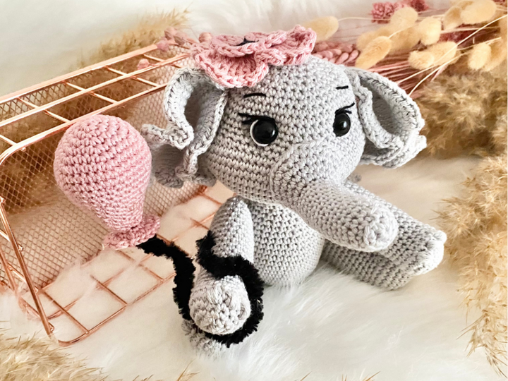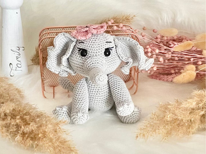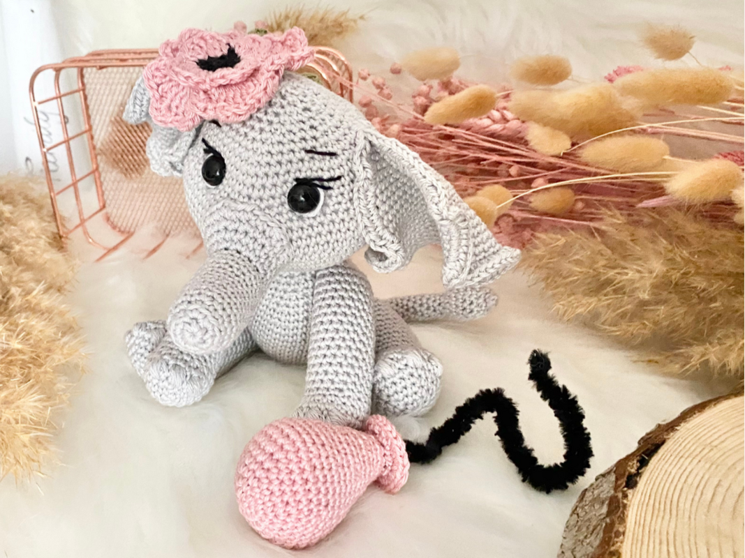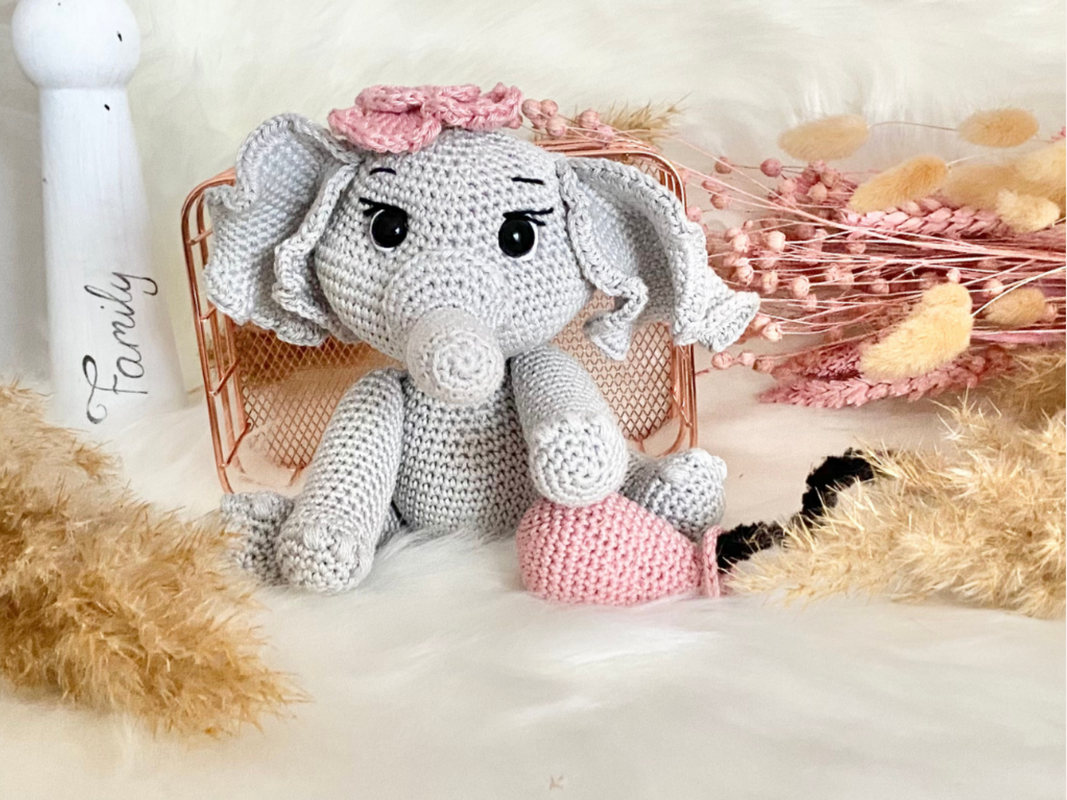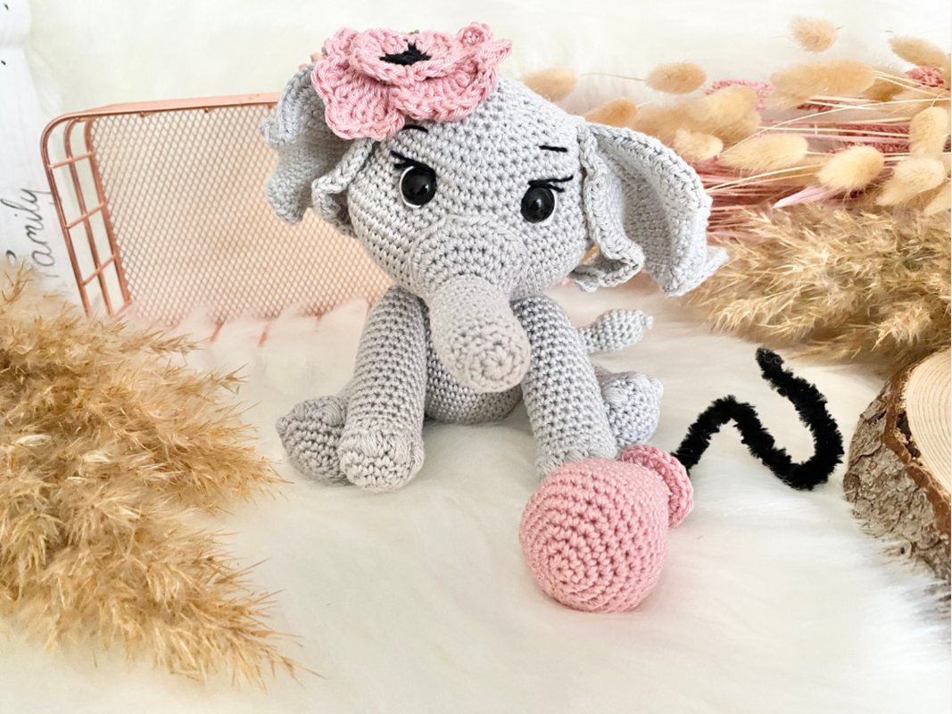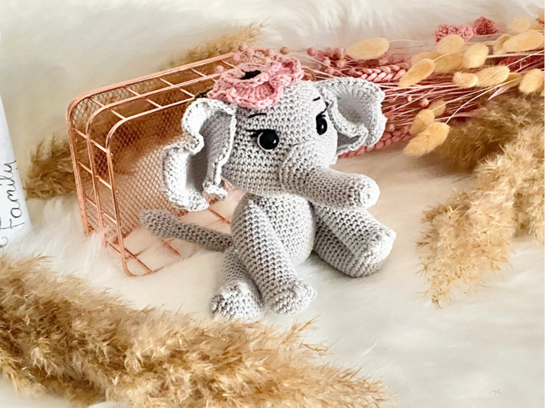 Eli, das Elefantenmädchen, verzaubert mit ihren großen Ohren und der hübschen Blume am Kopf. Sie ist ein wunderschönes Kuscheltier und bringt Kinderaugen zum Strahlen. Die Anleitung ist detailliert erklärt und ideal als Geschenkidee.
