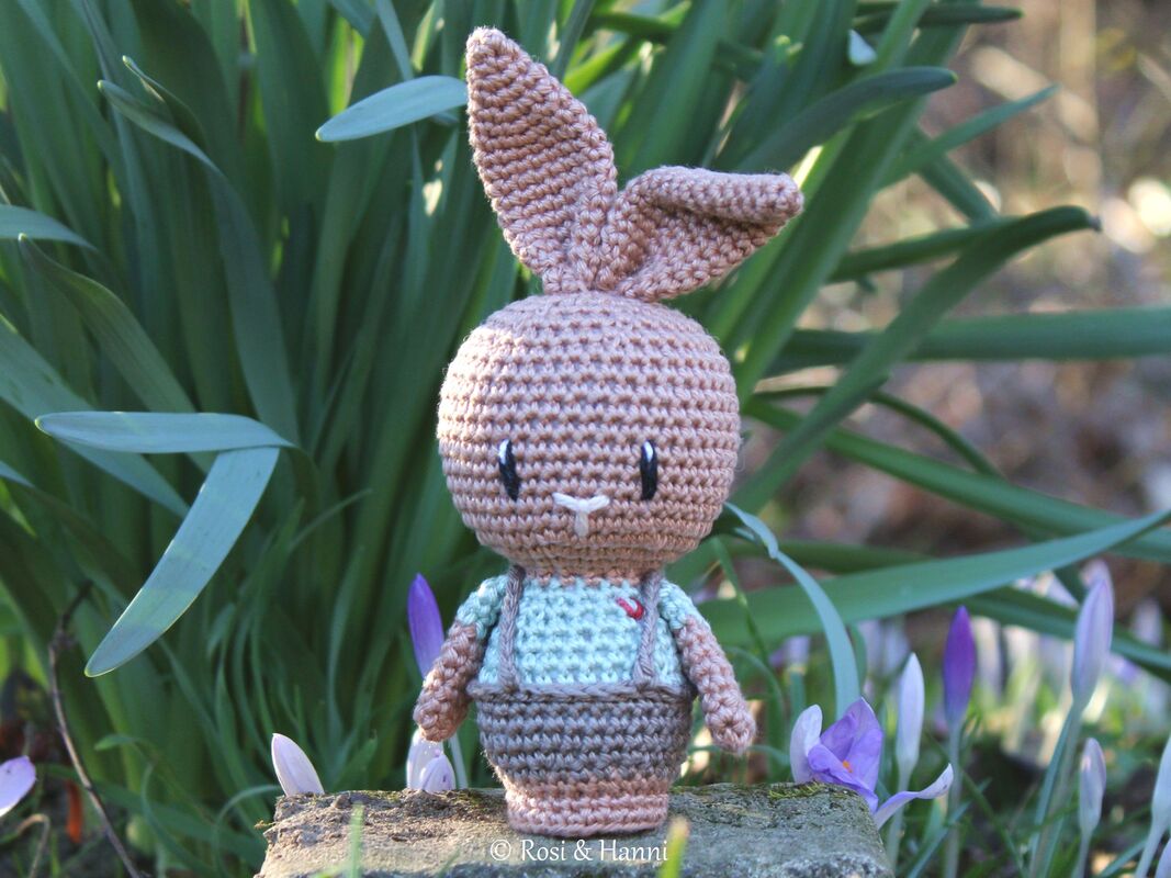 "Hasenjunge Erich" wird bei angegebener Wolle und Häkelnadel ca. 15 cm groß (mit Ohren).